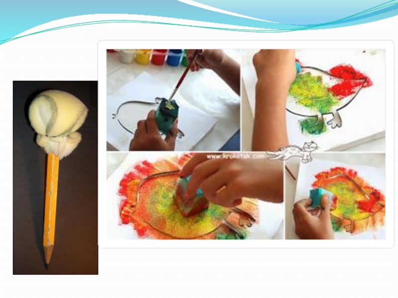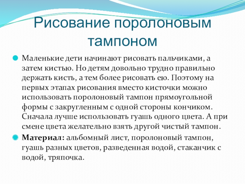 детям довольно трудно правильно держать кисть, а тем более рисовать ею. Поэтому на первых этапах рисования вместо кисточки можно использовать поролоновый тампон прямоугольной формы с закругленным с одной стороны кончиком. Сначала лучше использовать гуашь одного цвета. А при смене цвета желательно взять другой чистый тампон.
