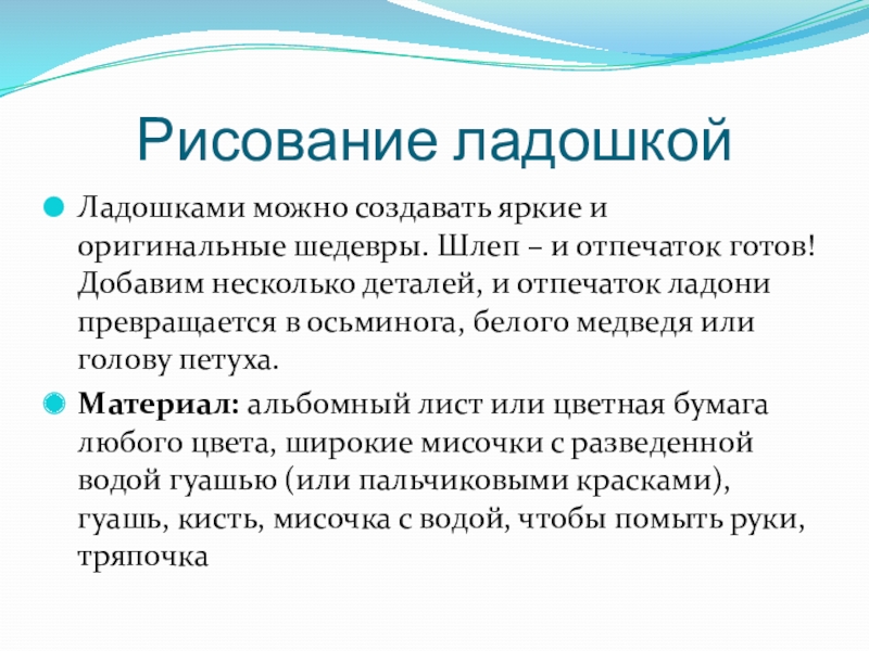 Материал: альбомный лист или цветная бумага любого цвета, широкие мисочки с разведенной водой гуашью (или пальчиковыми красками), гуашь, кисть, мисочка с водой, чтобы помыть руки, тряпочка