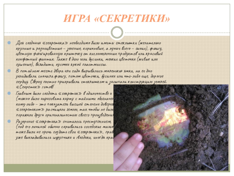 Главным было создать «секретик» в одиночестве и не забыть его местоположение (можно было нарисовать карту с тайными обозначениями). Показ «секретика» кому-либо – это показатель высшей степени доверия к человеку. Тогда над «секретиком» расчищали землю, так чтобы не было видно краев стекла, и поражали друга оригинальностью своего произведения.