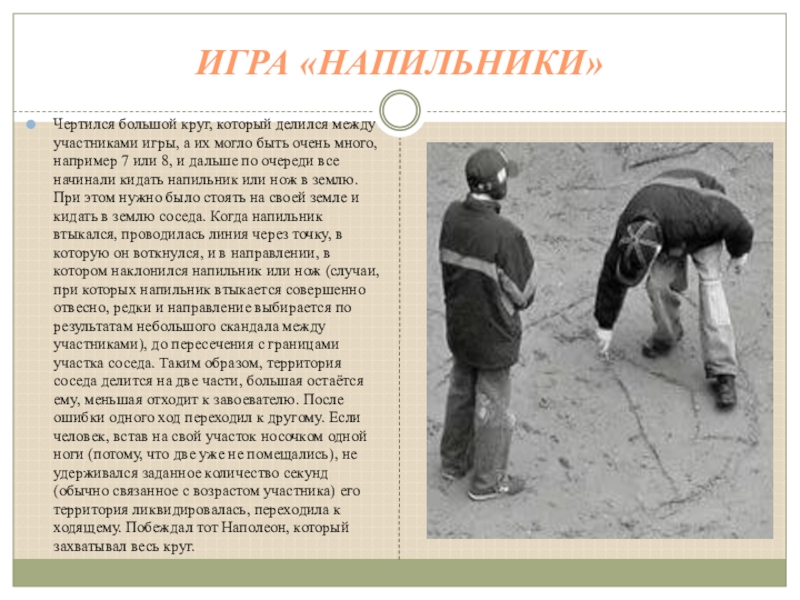 могло быть очень много, например 7 или 8, и дальше по очереди все начинали кидать напильник или нож в землю. При этом нужно было стоять на своей земле и кидать в землю соседа. Когда напильник втыкался, проводилась линия через точку, в которую он воткнулся, и в направлении, в котором наклонился напильник или нож (случаи, при которых напильник втыкается совершенно отвесно, редки и направление выбирается по результатам небольшого скандала между участниками), до пересечения с границами участка соседа. Таким образом, территория соседа делится на две части, большая остаётся ему, меньшая отходит к завоевателю. После ошибки одного ход переходил к другому. Если человек, встав на свой участок носочком одной ноги (потому, что две уже не помещались), не удерживался заданное количество секунд (обычно связанное с возрастом участника) его территория ликвидировалась, переходила к ходящему. Побеждал тот Наполеон, который захватывал весь круг.