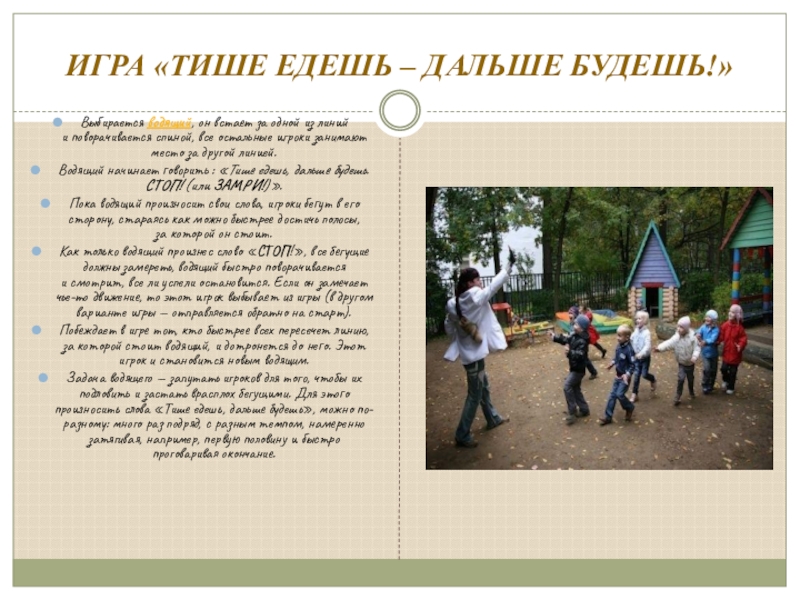 Слайд 3ИГРА «ТИШЕ ЕДЕШЬ – ДАЛЬШЕ БУДЕШЬ!»