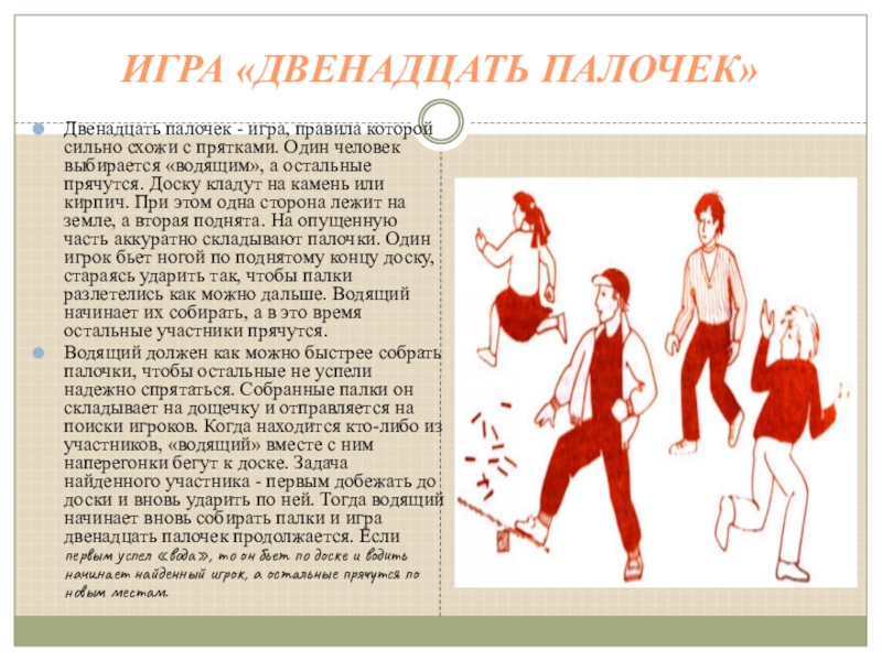 прятками. Один человек выбирается «водящим», а остальные прячутся. Доску кладут на камень или кирпич. При этом одна сторона лежит на земле, а вторая поднята. На опущенную часть аккуратно складывают палочки. Один игрок бьет ногой по поднятому концу доску, стараясь ударить так, чтобы палки разлетелись как можно дальше. Водящий начинает их собирать, а в это время остальные участники прячутся.