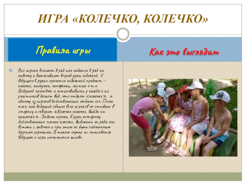 ряд на лавочку и вытягивают вперед руки лодочкой. У ведущего в руках прячется небольшой предмет — колечко, камушек, конфетка, листик и т.п. Ведущий проходит и остановившись у каждого из участников делает вид, что отдает «колечко», а одному из игроков действительно отдает его. После того, как ведущий обошел всех игроков он отходит в сторону и говорит «Колечко-колечко, выйди на крылечко». Задача игрока, в руки которому действительно попало колечко, выбежать их ряда или встать с лавочки и при этом не быть пойманным другими игроками. В таком случае он становится ведущим и игра начинается заново.