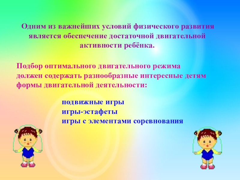 Подбор оптимального двигательного режима должен содержать разнообразные интересные детям формы двигательной деятельности: