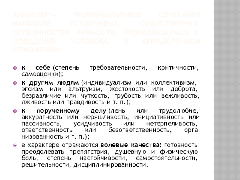 в характере отражаются волевые качества: готовность преодолевать препятствия, душевную и физическую боль, степень настойчивости, самостоятельности, решительности, дисциплинированности.