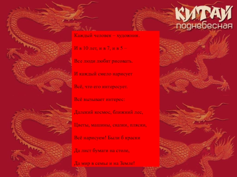 Каждый человек – художник.И в 10 лет, и в 7, и в 5 –Все люди любят рисовать.И