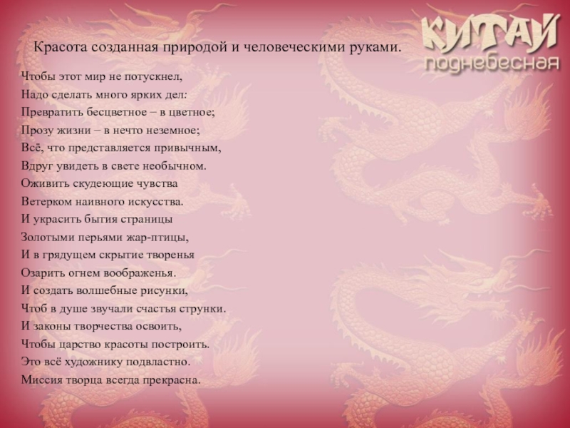 Красота созданная природой и человеческими руками.Чтобы этот мир не потускнел,Надо сделать много ярких дел:Превратить бесцветное – в цветное;Прозу жизни – в нечто неземное;Всё, что представляется привычным,Вдруг увидеть в свете необычном.Оживить скудеющие чувстваВетерком наивного искусства.И украсить бытия