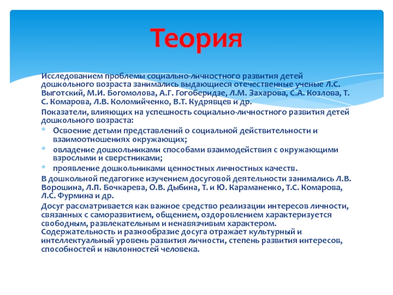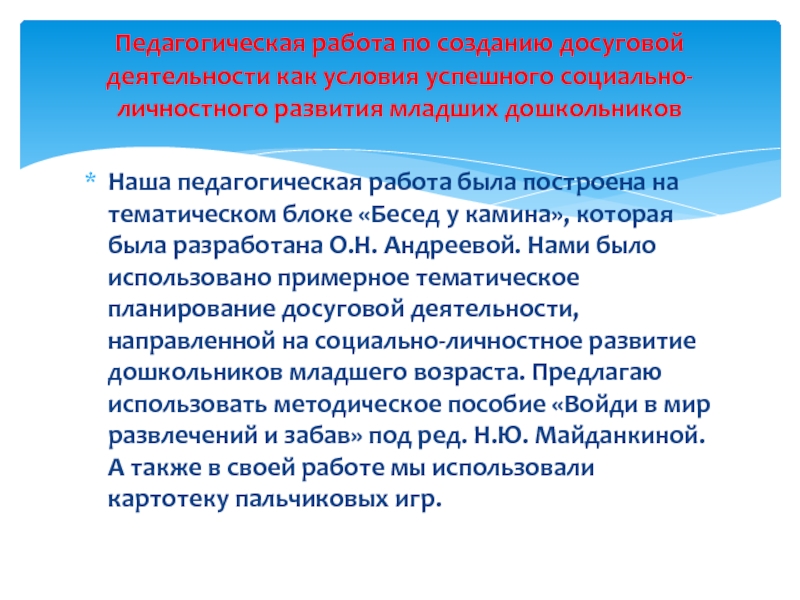 Педагогическая работа по созданию досуговой деятельности как условия успешного социально-личностного развития младших дошкольников