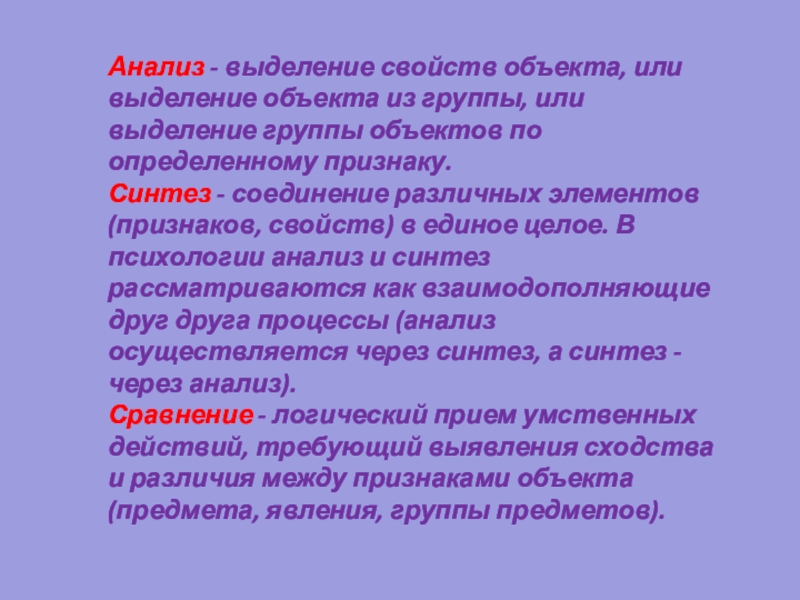 Синтез - соединение различных элементов (признаков, свойств) в единое целое. В психологии анализ и синтез рассматриваются как взаимодополняющие друг друга процессы (анализ осуществляется через синтез, а синтез - через анализ).