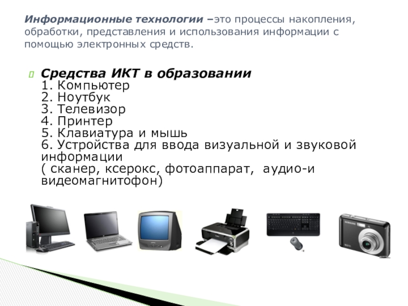 Информационные технологии –это процессы накопления, обработки, представления и использования информации с помощью электронных средств.