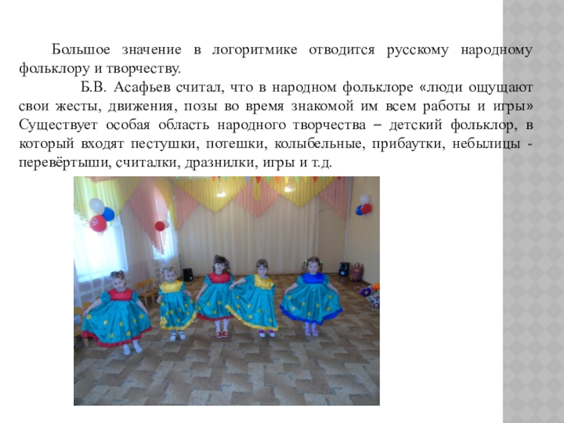 Слайд 8Большое значение в логоритмике отводится русскому народному фольклору и творчеству.