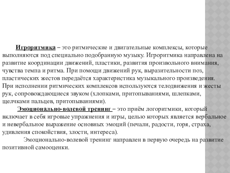 Слайд 7Игроритмика – это ритмические и двигательные комплексы, которые выполняются под специально