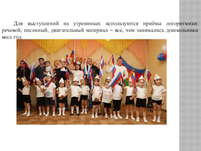 Слайд 9Для выступлений на утренниках используются приёмы логоритмики: речевой, песенный, двигательный материал