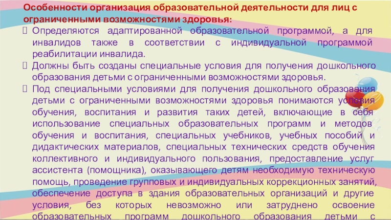 Слайд 18Особенности организация образовательной деятельности для лиц с ограниченными возможностями здоровья: