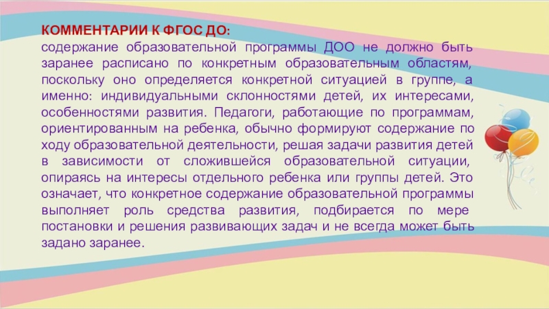 расписано по конкретным образовательным областям, поскольку оно определяется конкретной ситуацией в группе, а именно: индивидуальными склонностями детей, их интересами, особенностями развития. Педагоги, работающие по программам, ориентированным на ребенка, обычно формируют содержание по ходу образовательной деятельности, решая задачи развития детей в зависимости от сложившейся образовательной ситуации, опираясь на интересы отдельного ребенка или группы детей. Это означает, что конкретное содержание образовательной программы выполняет роль средства развития, подбирается по мере постановки и решения развивающих задач и не всегда может быть задано заранее.