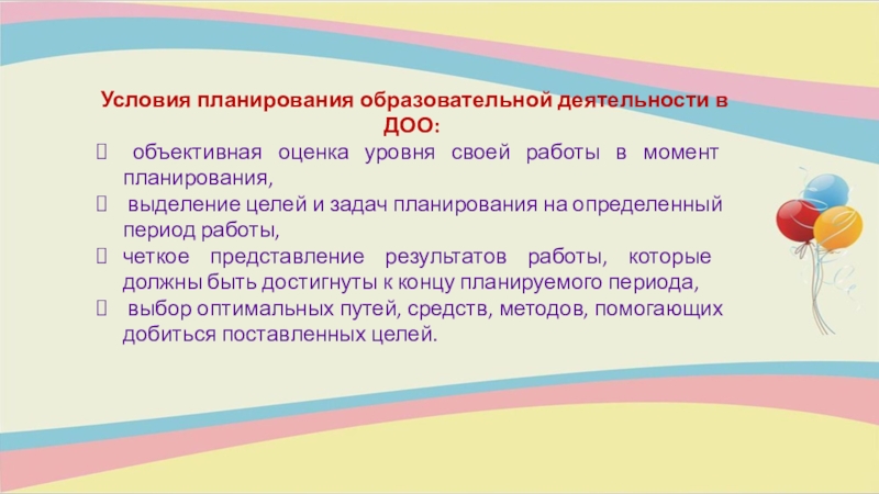 Слайд 17Условия планирования образовательной деятельности в ДОО: