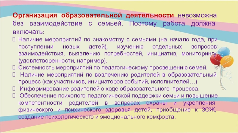Слайд 19Организация образовательной деятельности невозможна без взаимодействие с семьей. Поэтому работа должна