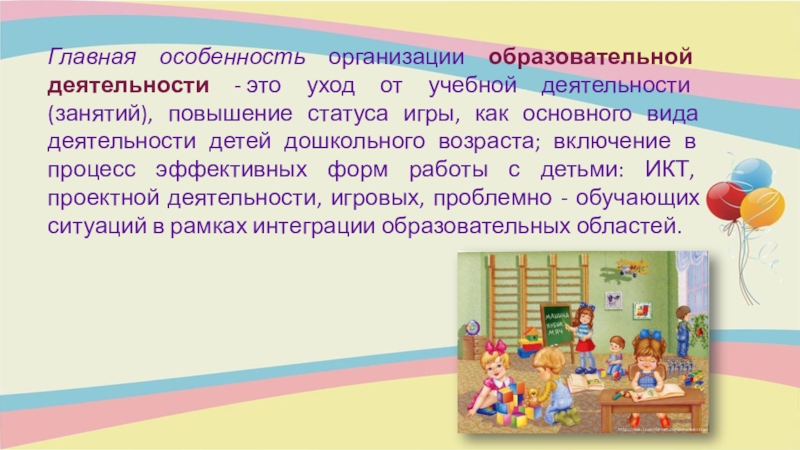 Слайд 7Главная особенность организации образовательной деятельности - это уход от учебной деятельности (занятий),