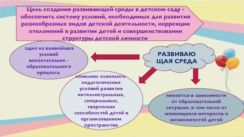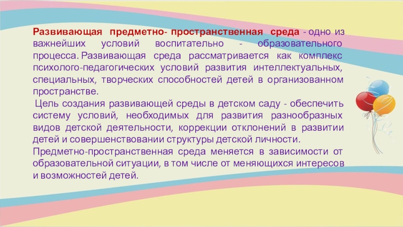 процесса. Развивающая среда рассматривается как комплекс психолого-педагогических условий развития интеллектуальных, специальных, творческих способностей детей в организованном пространстве.