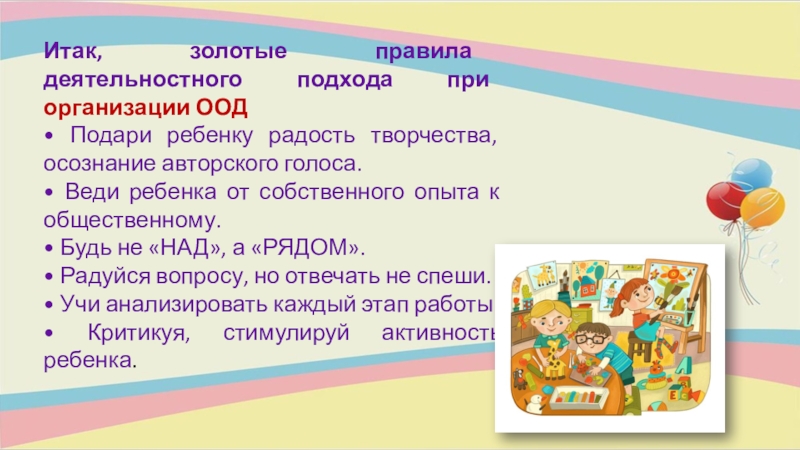 Слайд 9Итак, золотые правила деятельностного подхода при организации ООД