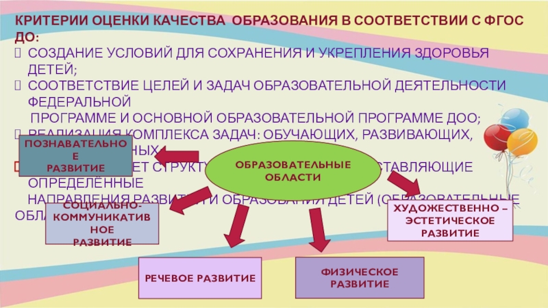 Слайд 5КРИТЕРИИ ОЦЕНКИ КАЧЕСТВА ОБРАЗОВАНИЯ В СООТВЕТСТВИИ С ФГОС ДО: