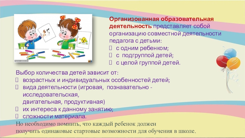 Слайд 8Организованная образовательная деятельность представляет собой организацию совместной деятельности педагога с детьми: