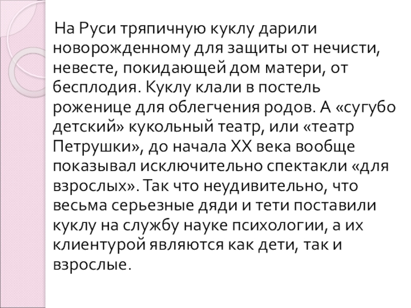 нечисти, невесте, покидающей дом матери, от бесплодия. Куклу клали в постель роженице для облегчения родов. А «сугубо детский» кукольный театр, или «театр Петрушки», до начала XX века вообще показывал исключительно спектакли «для взрослых». Так что неудивительно, что весьма серьезные дяди и тети поставили куклу на службу науке психологии, а их клиентурой являются как дети, так и взрослые.