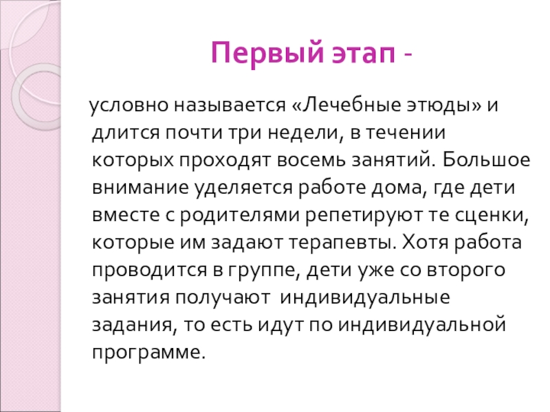 три недели, в течении которых проходят восемь занятий. Большое внимание уделяется работе дома, где дети вместе с родителями репетируют те сценки, которые им задают терапевты. Хотя работа проводится в группе, дети уже со второго занятия получают индивидуальные задания, то есть идут по индивидуальной программе.