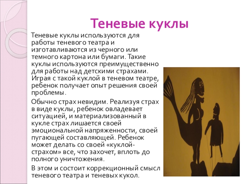 и изготавливаются из черного или темного картона или бумаги. Такие куклы используются преимущественно для работы над детскими страхами. Играя с такой куклой в теневом театре, ребенок получает опыт решения своей проблемы.