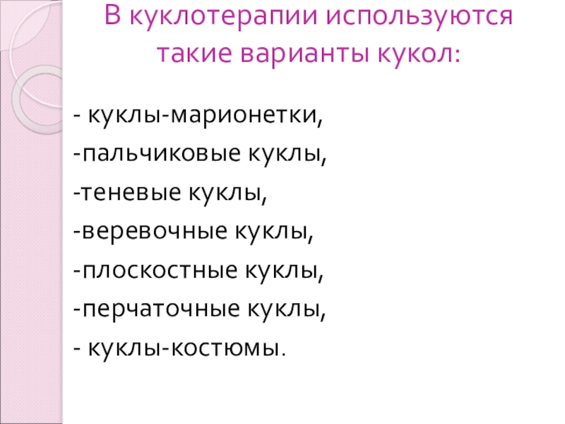 Слайд 16В куклотерапии используются такие варианты кукол: