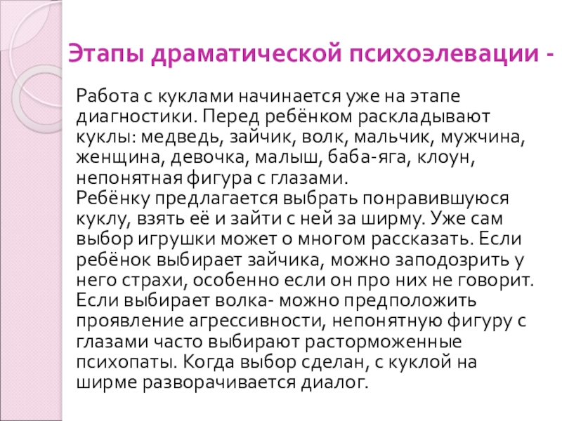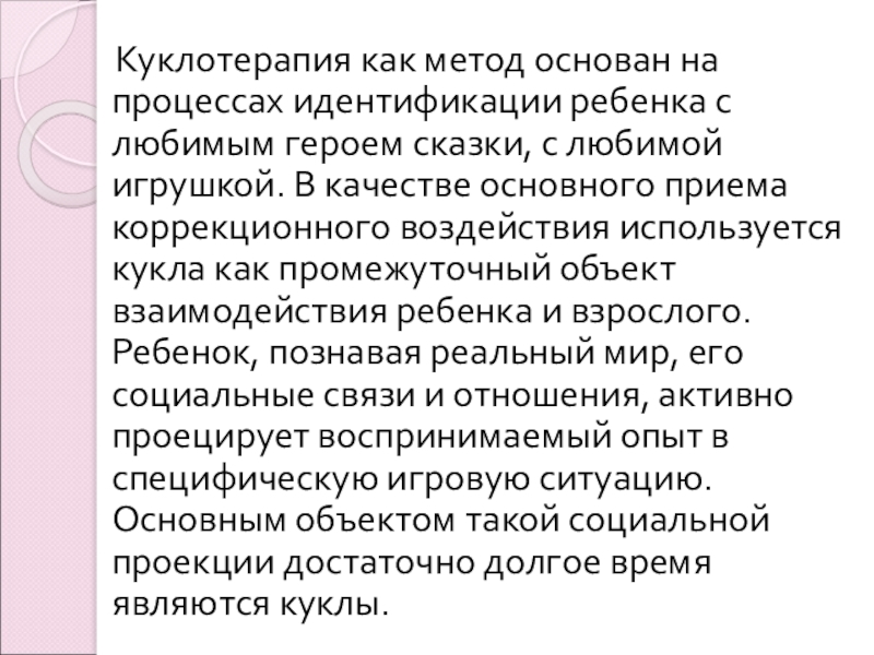 Слайд 3 Куклотерапия как метод основан на процессах идентификации ребенка с