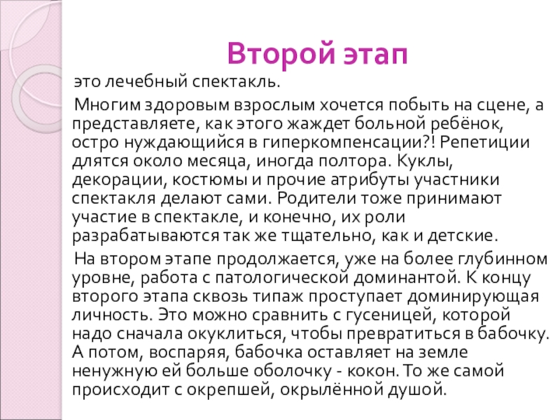 На втором этапе продолжается, уже на более глубинном уровне, работа с патологической доминантой. К концу второго этапа сквозь типаж проступает доминирующая личность. Это можно сравнить с гусеницей, которой надо сначала окуклиться, чтобы превратиться в бабочку. А потом, воспаряя, бабочка оставляет на земле ненужную ей больше оболочку - кокон. То же самой происходит с окрепшей, окрылённой душой.