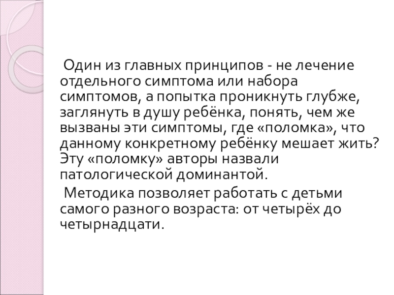 не лечение отдельного симптома или набора симптомов, а попытка проникнуть глубже, заглянуть в душу ребёнка, понять, чем же вызваны эти симптомы, где «поломка», что данному конкретному ребёнку мешает жить? Эту «поломку» авторы назвали патологической доминантой.