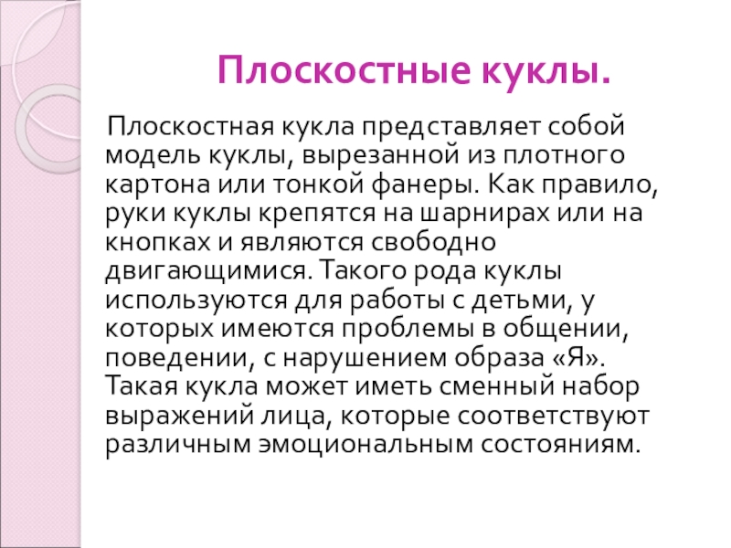 из плотного картона или тонкой фанеры. Как правило, руки куклы крепятся на шарнирах или на кнопках и являются свободно двигающимися. Такого рода куклы используются для работы с детьми, у которых имеются проблемы в общении, поведении, с нарушением образа «Я». Такая кукла может иметь сменный набор выражений лица, которые соответствуют различным эмоциональным состояниям.