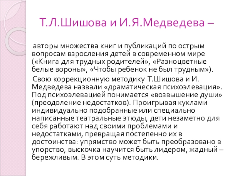 Свою коррекционную методику Т.Шишова и И.Медведева назвали «драматическая психоэлевация». Под психоэлевацией понимается «возвышение души» (преодоление недостатков). Проигрывая куклами индивидуально подобранные или специально написанные театральные этюды, дети незаметно для себя работают над своими проблемами и недостатками, превращая постепенно их в достоинства: упрямство может быть преобразовано в упорство, выскочка научится быть лидером, жадный – бережливым. В этом суть методики.