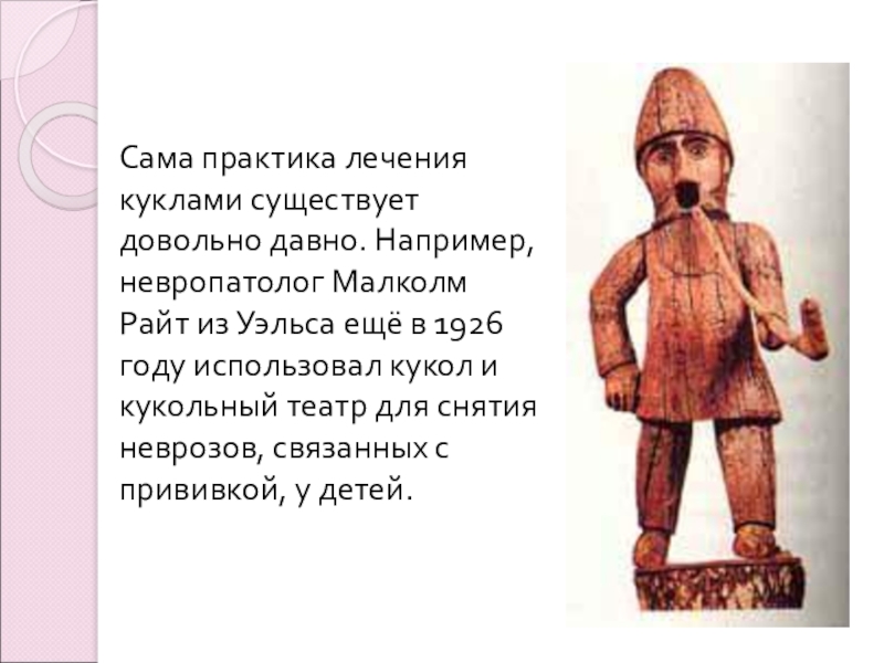 Слайд 6Сама практика лечения куклами существует довольно давно. Например, невропатолог Малколм Райт
