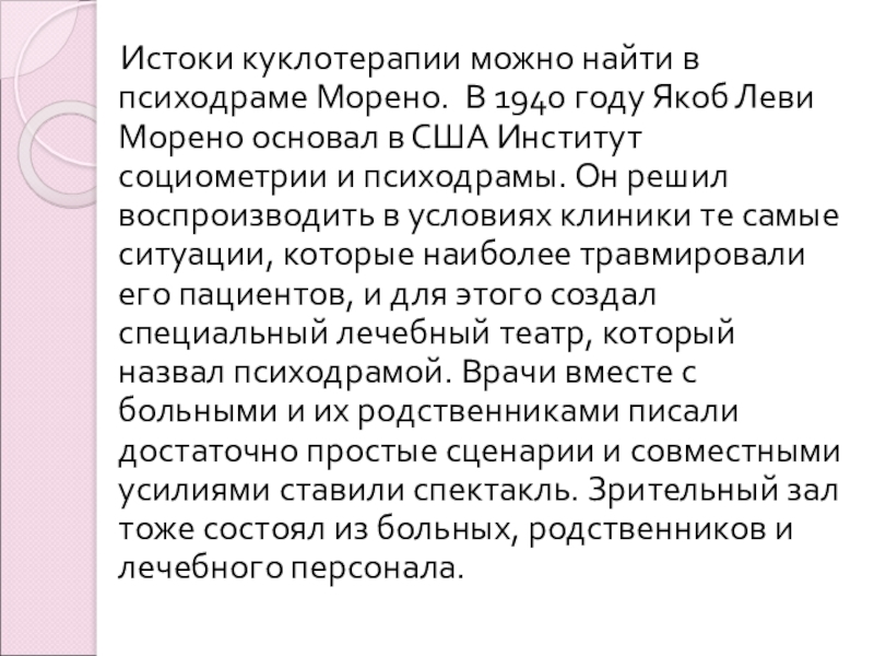 Слайд 7 Истоки куклотерапии можно найти в психодраме Морено. В 1940