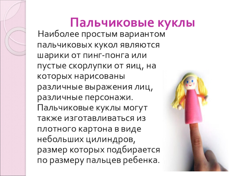 пинг-понга или пустые скорлупки от яиц, на которых нарисованы различные выражения лиц, различные персонажи. Пальчиковые куклы могут также изготавливаться из плотного картона в виде небольших цилиндров, размер которых подбирается по размеру пальцев ребенка.