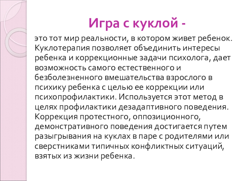живет ребенок. Куклотерапия позволяет объединить интересы ребенка и коррекционные задачи психолога, дает возможность самого естественного и безболезненного вмешательства взрослого в психику ребенка с целью ее коррекции или психопрофилактики. Используется этот метод в целях профилактики дезадаптивного поведения. Коррекция протестного, оппозиционного, демонстративного поведения достигается путем разыгрывания на куклах в паре с родителями или сверстниками типичных конфликтных ситуаций, взятых из жизни ребенка.