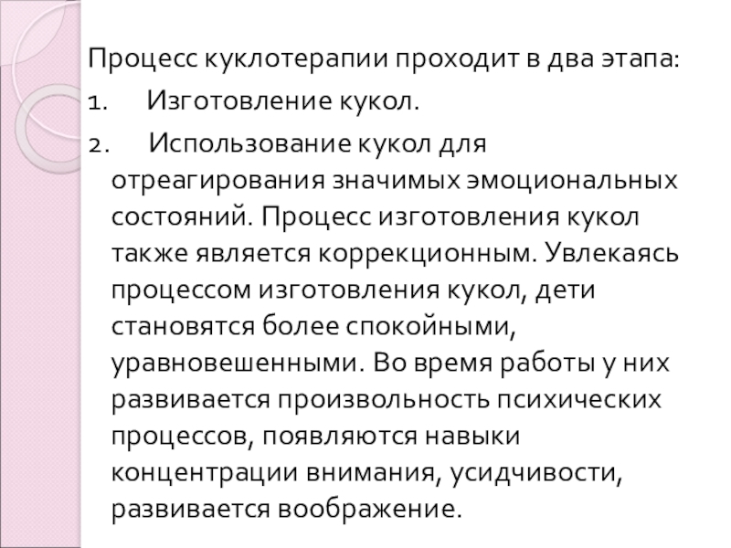 отреагирования значимых эмоциональных состояний. Процесс изготовления кукол также является коррекционным. Увлекаясь процессом изготовления кукол, дети становятся более спокойными, уравновешенными. Во время работы у них развивается произвольность психических процессов, появляются навыки концентрации внимания, усидчивости, развивается воображение.