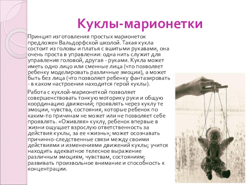 Работа с куклой-марионеткой позволяет совершенствовать тонкую моторику руки и общую координацию движений; проявлять через куклу те эмоции, чувства, состояния, которые ребенок по каким-то причинам не может или не позволяет себе проявлять. «Оживляя» куклу, ребенок впервые в жизни ощущает взрослую ответственность за действия куклы, за ее «жизнь»; может осознавать причинно-следственные связи между своими действиями и изменениями движений куклы; учится находить адекватное телесное выражение различным эмоциям, чувствам, состояниям; развивать произвольное внимание и способность к концентрации.