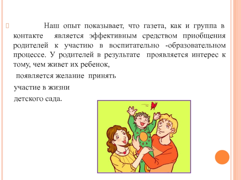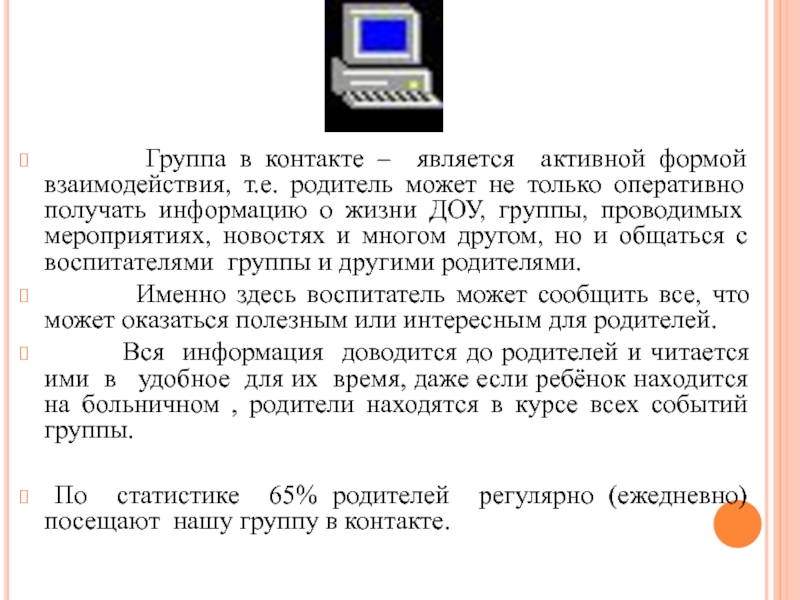 группа в контакте является эффективным средством приобщения родителей к участию в воспитательно -образовательном процессе. У родителей в результате проявляется интерес к тому, чем живет их ребенок,