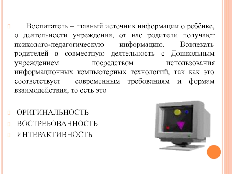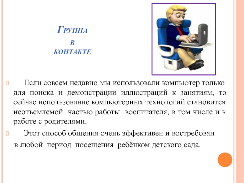 только для поиска и демонстрации иллюстраций к занятиям, то сейчас использование компьютерных технологий становится неотъемлемой частью работы воспитателя, в том числе и в работе с родителями.