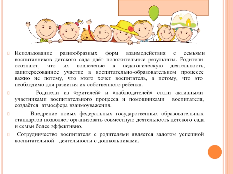 Слайд 19Использование разнообразных форм взаимодействия с семьями воспитанников детского сада даёт положительные