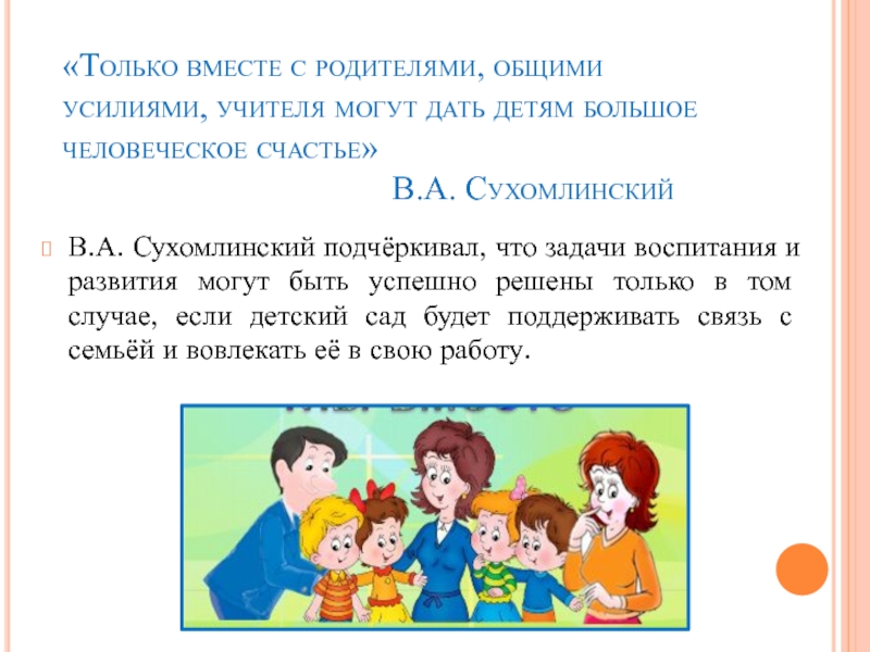 В.А. Сухомлинский подчёркивал, что задачи воспитания и развития могут быть успешно решены только в том случае, если детский сад будет поддерживать связь с семьёй и вовлекать её в свою работу.