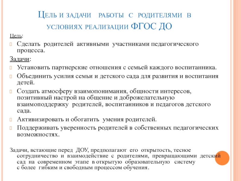 Задачи, встающие перед ДОУ, предполагают его открытость, тесное сотрудничество и взаимодействие с родителями, превращающими детский сад на современном этапе в открытую образовательную систему с более гибким и свободным процессом обучения.