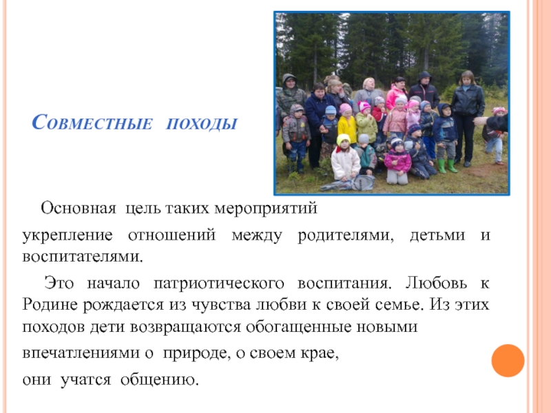 Это начало патриотического воспитания. Любовь к Родине рождается из чувства любви к своей семье. Из этих походов дети возвращаются обогащенные новыми