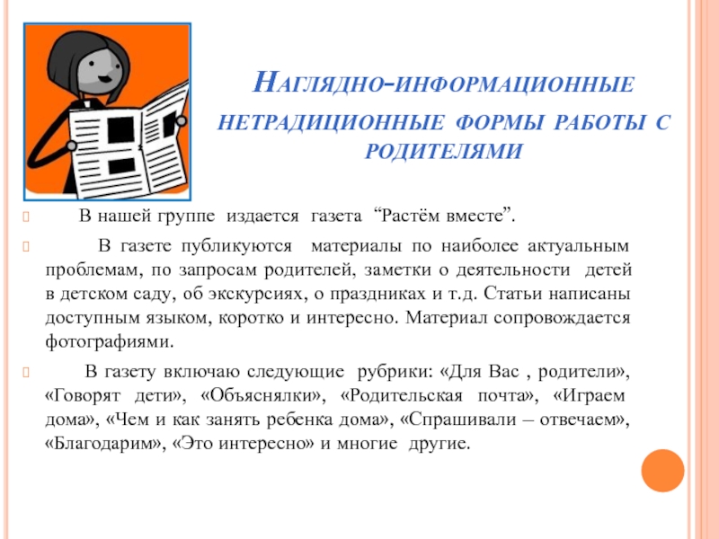 Слайд 9Наглядно-информационные нетрадиционные формы работы с родителями