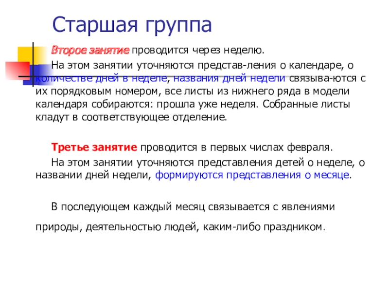В старшей и подготовительной группах воспитатель знакомит детей при помощи календаря с неделей, месяцем и годом. Также в старшем дошкольном возрасте у детей развивают чувство времени.