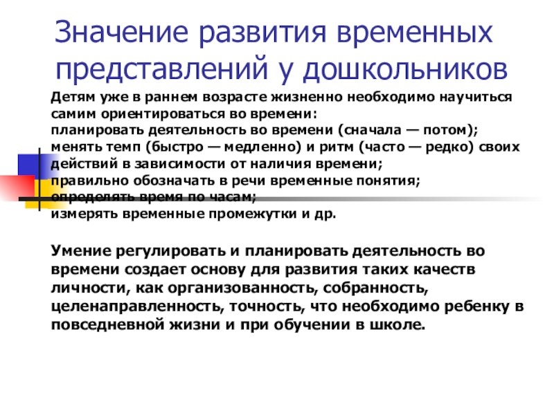 Слайд 6Значение развития временных представлений у дошкольников